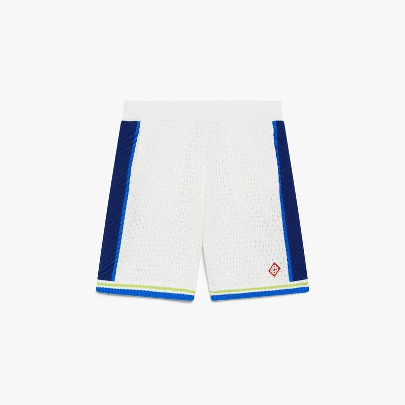 Die weiß-blauen Häkel-Shorts sind ein raffiniertes Design aus offen gewebtem Stoff mit Streifen an den Seiten. Abgerundet durch einen elastischen Bund, einen Kordelzug, seitliche Eingrifftaschen und gestreifte Kanten an den Beinen.