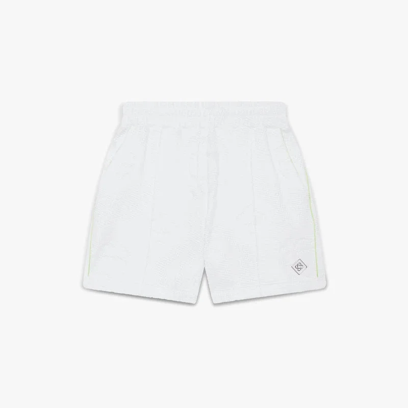 Die weiße Monogram-Frottee-Shorts besticht durch ein raffiniertes Design mit dem ikonischen Monogram-Muster des Hauses sowie dem charakteristischen Diamond Monogram-Logo. Abgerundet wird das Modell durch einen elastischen Bund, einen Kordelzug, schräge Taschen, eine aufgesetzte Gesäßtasche sowie kontrastierende Paspeln an den Seiten und entlang der Taschen.