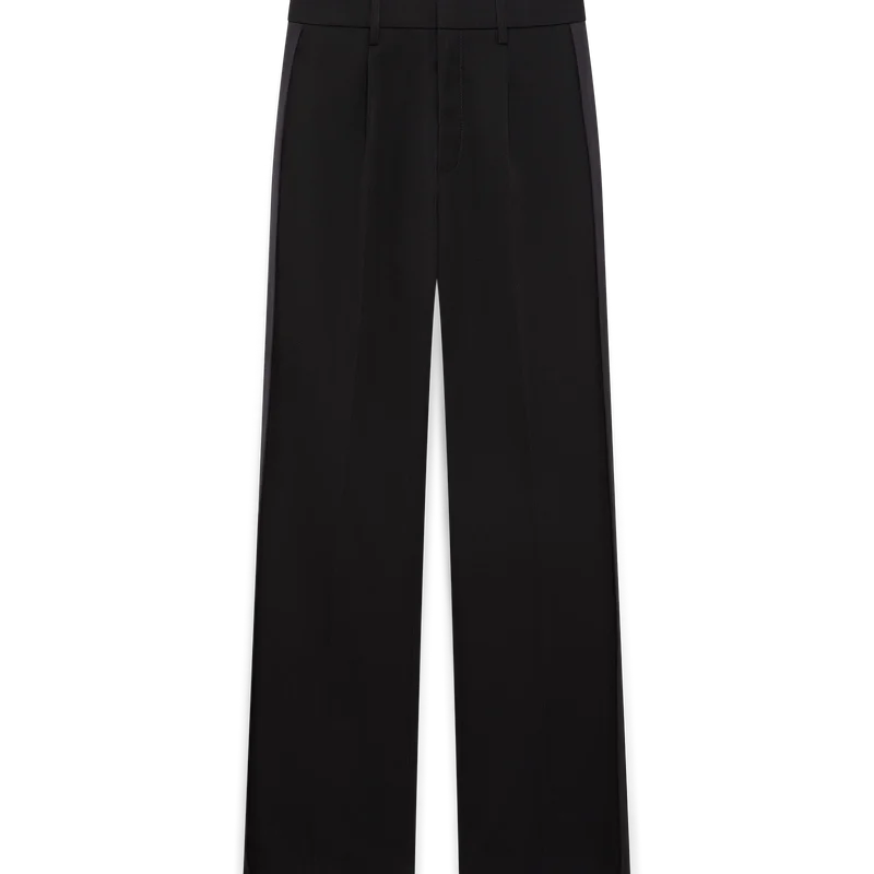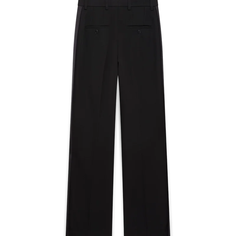 Die plissierte Anzughose aus Wolle ist ein Modell mit geradem Bein aus Anzugstoff. Mit Frontfalten, Reißverschluss, schrägen Vordertaschen, Futter, Gürtelschlaufen, Paspeltaschen hinten und Viskose-Einsätzen an den Seiten.