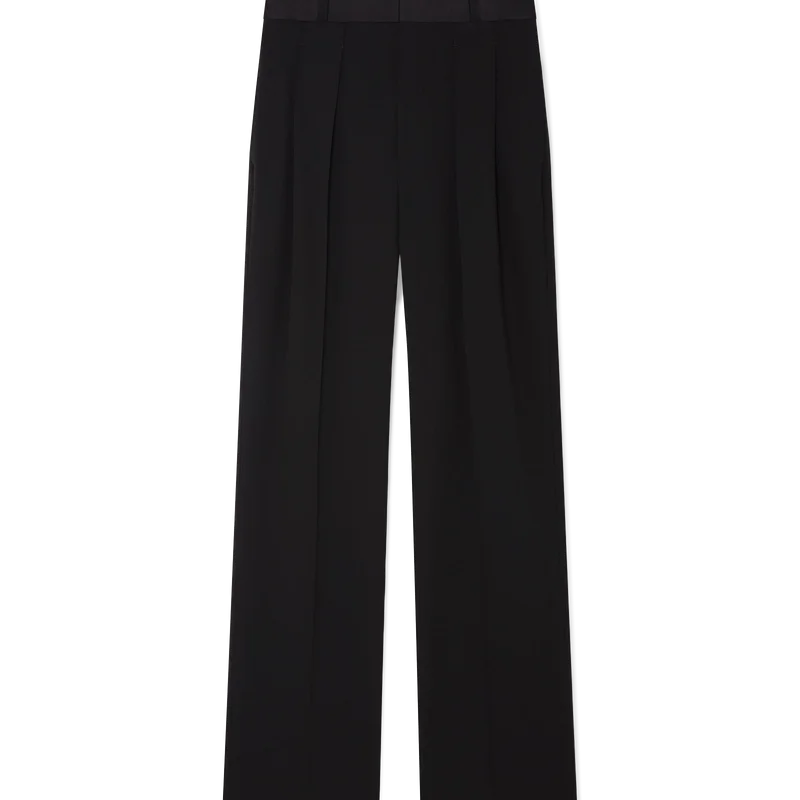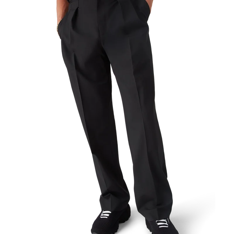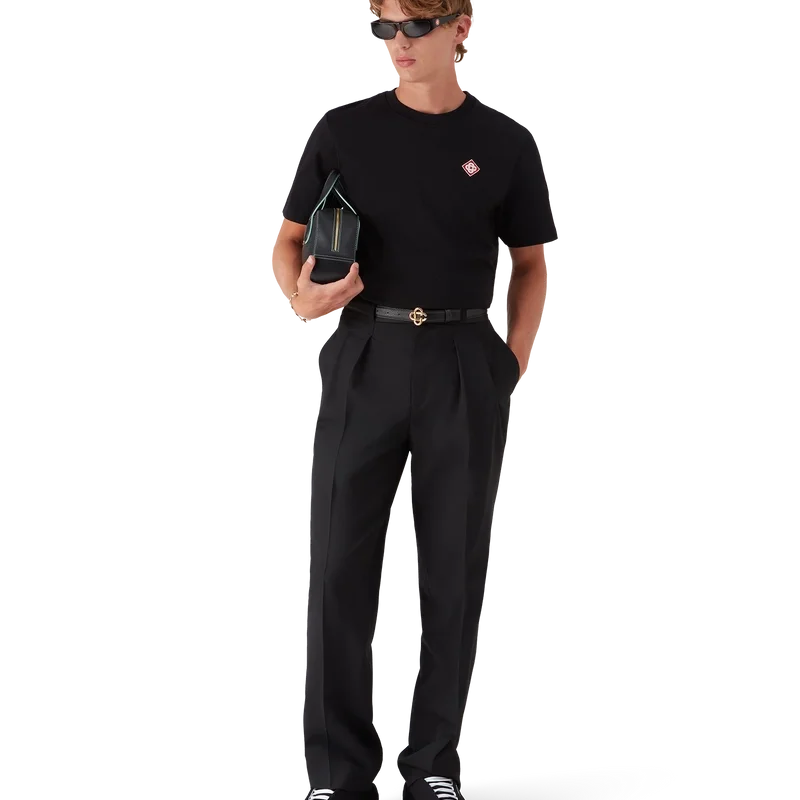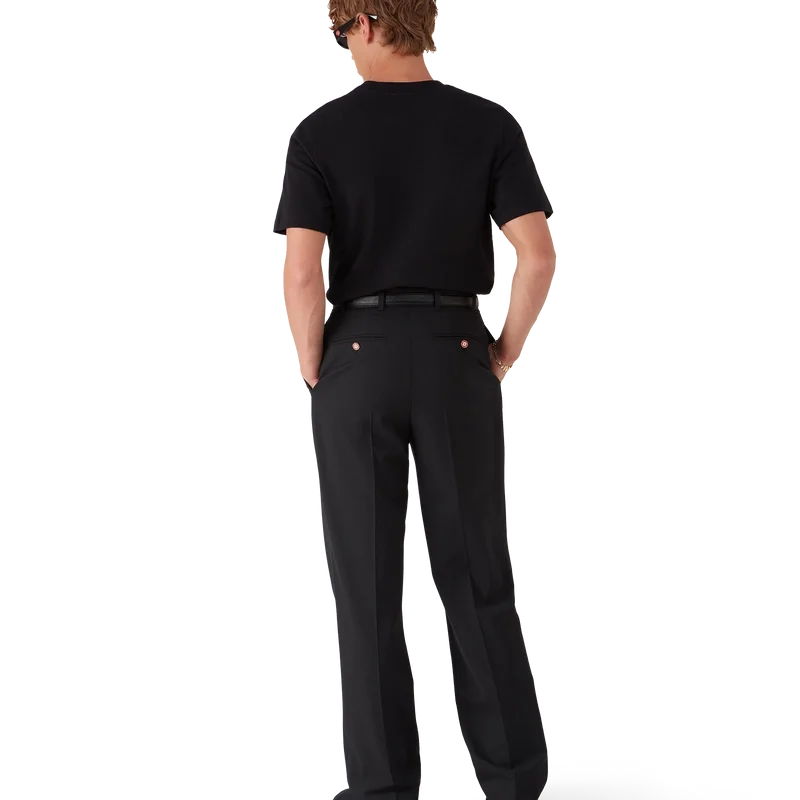 Die plissierte Anzughose aus Wolle ist ein Modell mit geradem Bein aus Anzugstoff. Sie verfügt über Frontfalten, einen Reißverschluss, schräge Vordertaschen, ein Futter, Gürtelschlaufen und aufgesetzte Gesäßtaschen mit dem vergoldeten, emaillierten „Interlocking Cc“-Logo des Hauses sowie flachen Knöpfen.