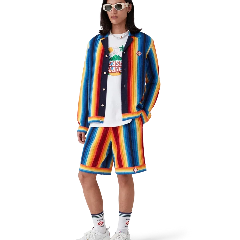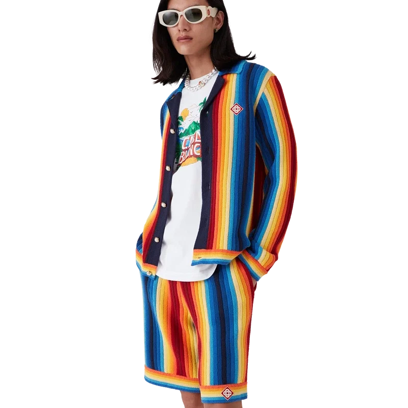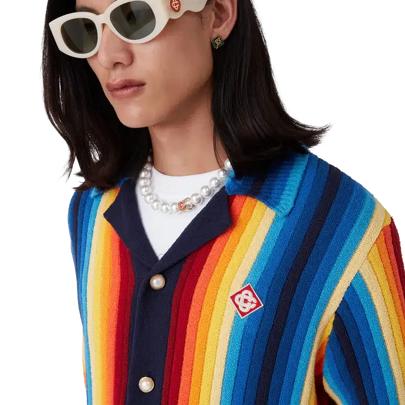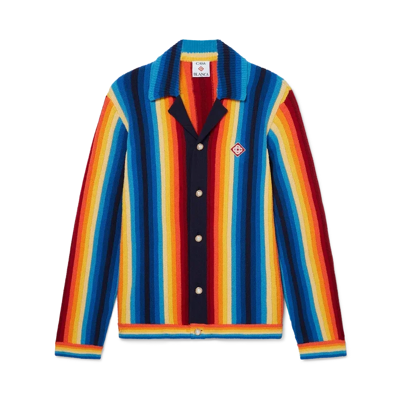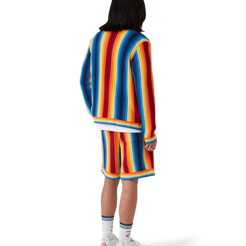 Die Frottee-Jacke mit Farbverlaufsstreifen ist ein langärmeliges Modell aus gestricktem Frottee-Stoff mit Farbverlauf. Mit Knopfleiste, charakteristischen goldenen Perlenknöpfen sowie geripptem Kragen, Bündchen und Saum.