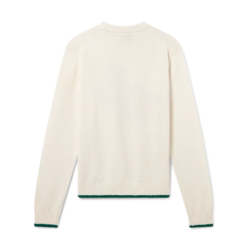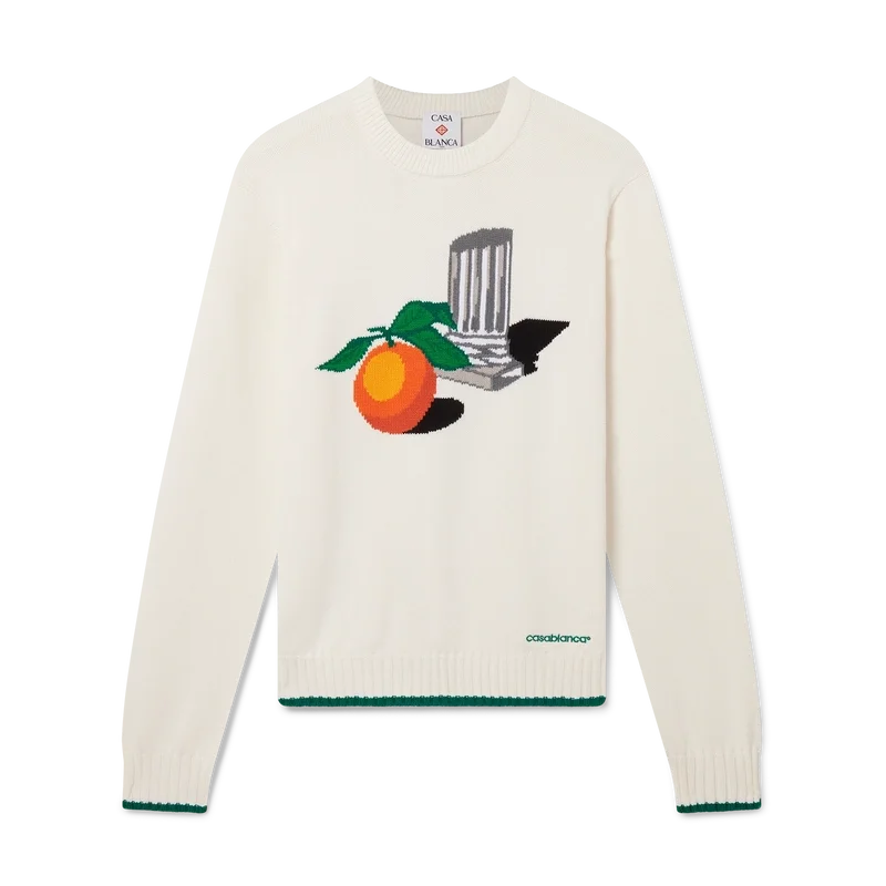 Der Intarsia-Pullover ist ein weißer Langarm-Strickpullover mit dem saisonalen, vom antiken Griechenland inspirierten Kunstmotiv des Hauses und dem charakteristischen Designelement des Hauses – der Farbe Orange – aus atmungsaktivem Baumwollstoff gefertigt. Der Stil wird durch einen klassischen Rundhalsausschnitt, einen gerippten Kragen sowie Ärmelbündchen und Saum mit kontrastierenden Kantenverzierungen abgerundet.
