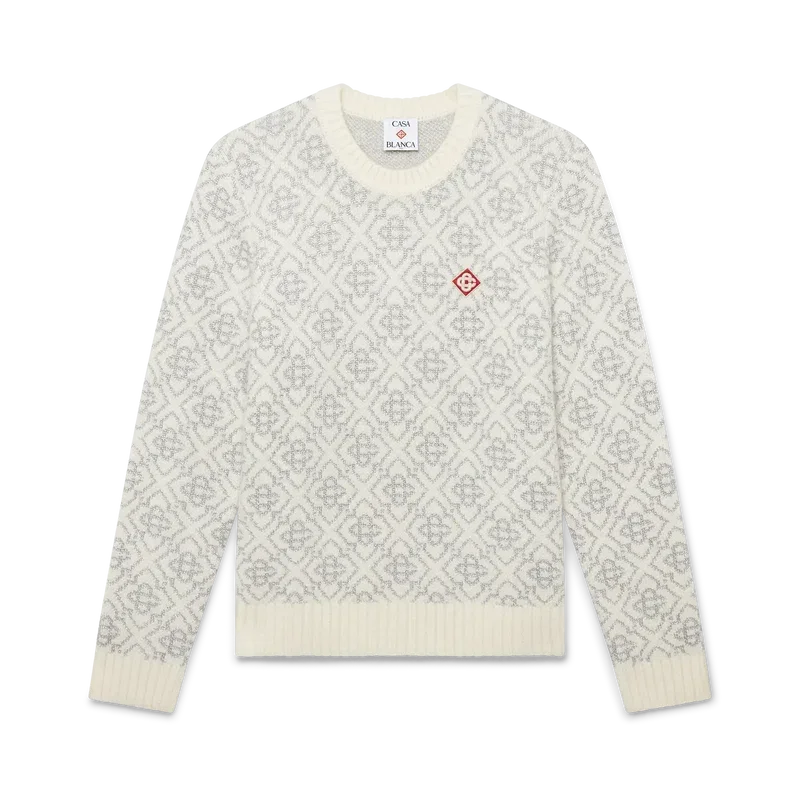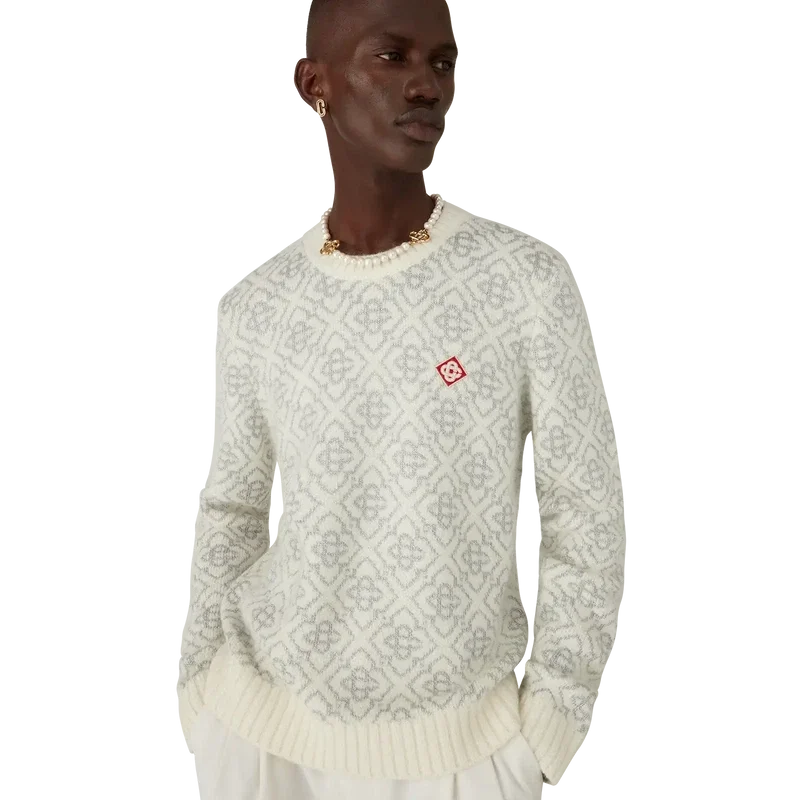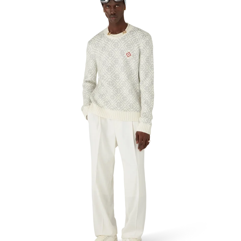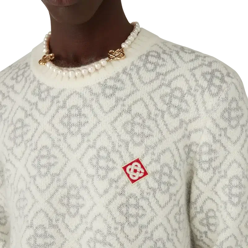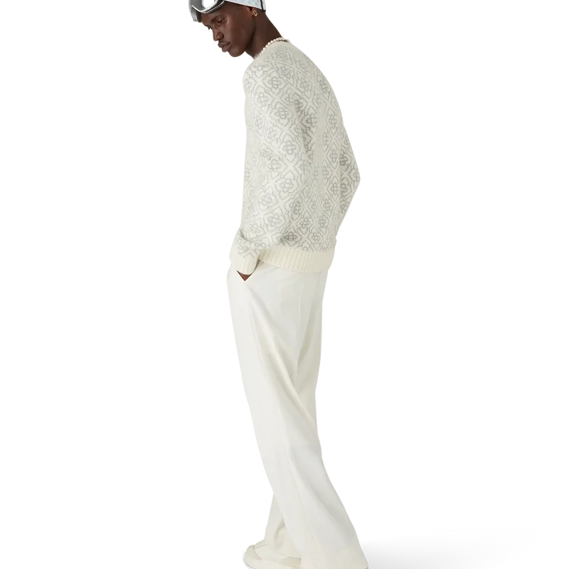 Der Ski Jumper ist ein raffiniertes Apras-Sport-Design aus Mohairstoff mit dem weißen und grauen Monogramm-Motiv des Hauses, inspiriert von Frostmustern an traditionellen japanischen Bauernhausfenstern. Das Design, das sich an Schneekristallen auf Bambushainen orientiert, verbindet sportlich-elegante Freizeitmode mit alpiner Funktionalität. Abgerundet durch einen Rundhalsausschnitt und einen Saum aus Rippstrick.