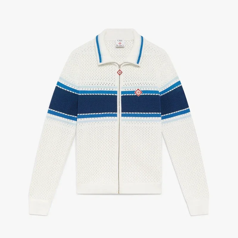 Die gestreifte Mesh-Trainingsjacke besticht durch ein raffiniertes Design mit einem blauen Streifen über Brust, Ärmeln und Rücken. Abgerundet wird sie durch einen Reißverschluss mit dem charakteristischen Diamant-Logo des Hauses, einen Strickkragen, Ärmelbündchen und einen Saum mit blauen Streifen als Kantenverzierung sowie Seitentaschen.