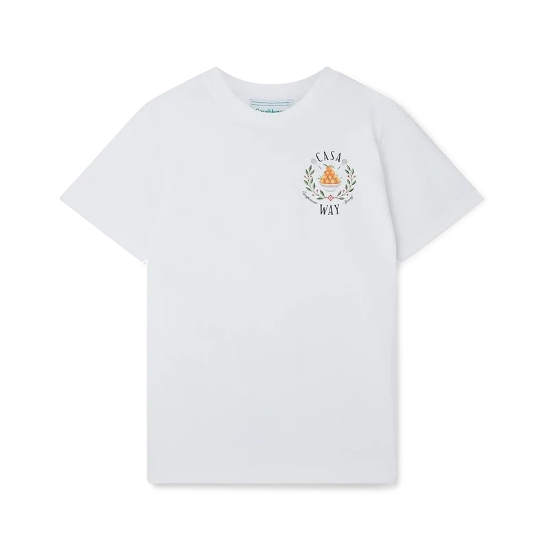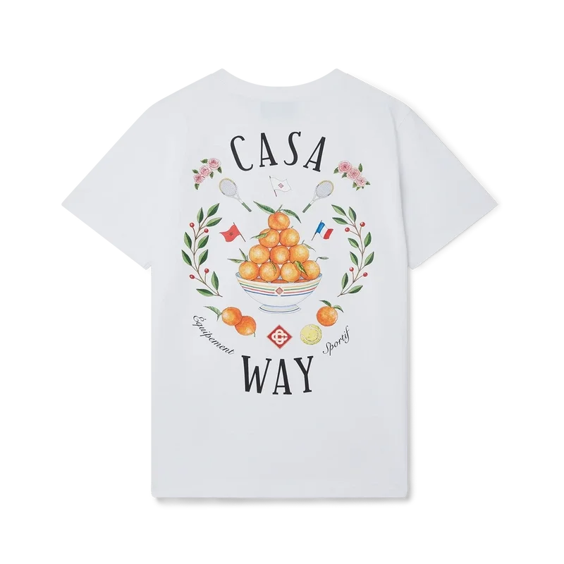Das Casa Way T-Shirt zeigt einen Aufdruck der klassischen ikonografischen Motive des Hauses mit der orangefarbenen Pyramide, Tennisschlägern und einem Blumenmuster, das sich in einem größeren Aufdruck auf der Rückseite wiederholt. Hergestellt aus 100 % Bio-Baumwolle und mit klassischem Rundhalsausschnitt sowie einem Casablanca-Markenlabel versehen.