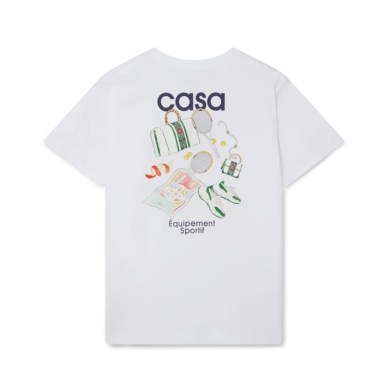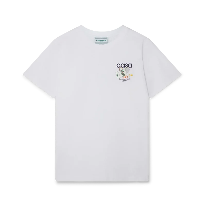 Das Equipement Sportif T-Shirt verfügt über einen Aufdruck des für diese Saison neu interpretierten charakteristischen Kunstwerks des Hauses auf der linken Brustseite, der sich in einem größeren Aufdruck auf der Rückseite wiederholt. Hergestellt aus 100 % Bio-Baumwolle und versehen mit einem klassischen Rundhalsausschnitt sowie einem Casablanca-Markenlabel.