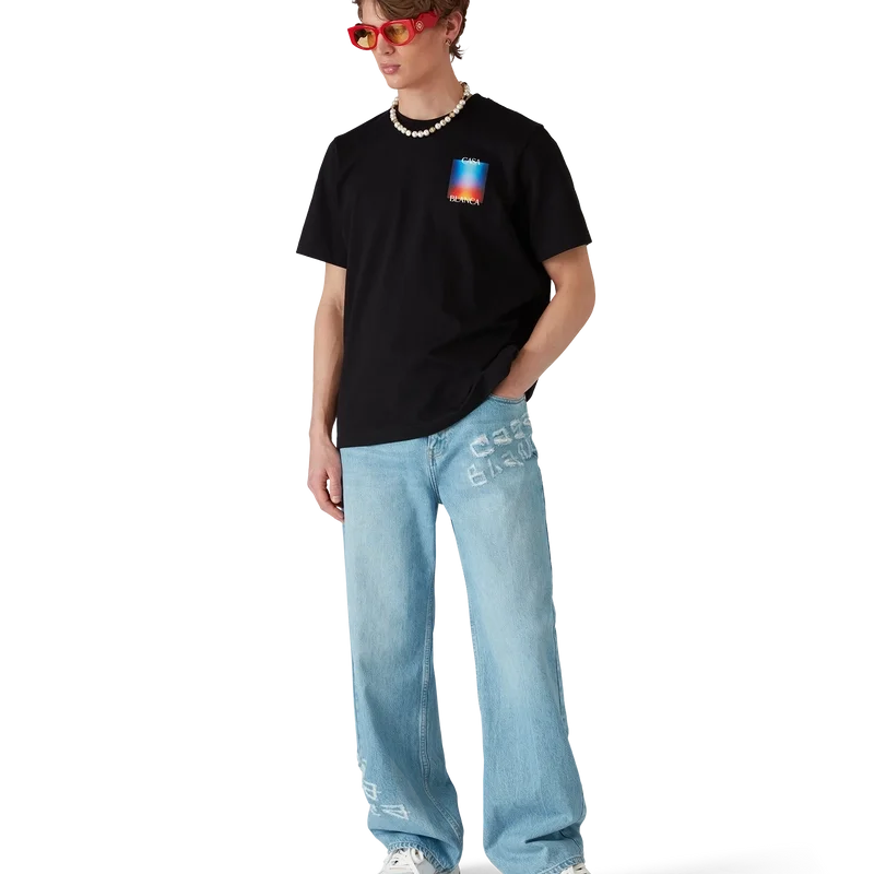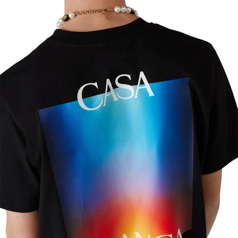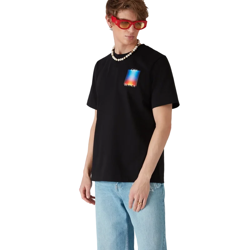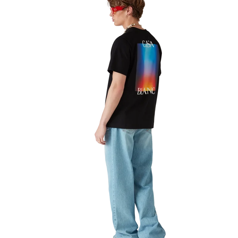 Das Gradient Casa Logo T-Shirt ist ein kurzärmeliges, bedrucktes Design aus Bio-Baumwolle mit dem saisonalen Farbverlauf des Hauses, inspiriert von einer futuristischen Interpretation des Casablanca-Farbverlaufs: Eine Halo-Form, inspiriert von Vintage-Sci-Fi-Postern und Schallplatten. Abgerundet durch einen klassischen Rundhalsausschnitt.