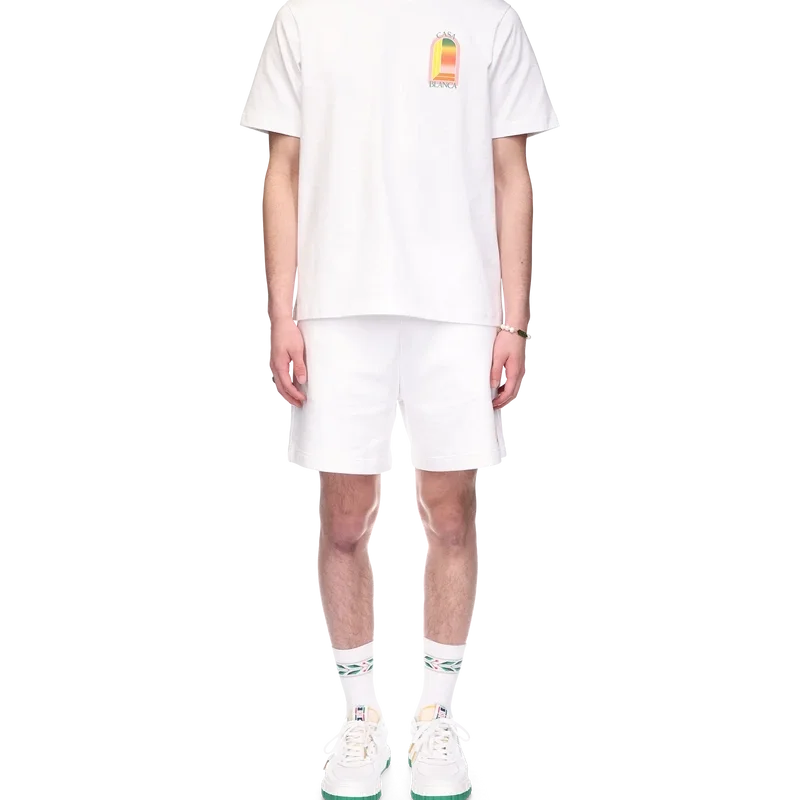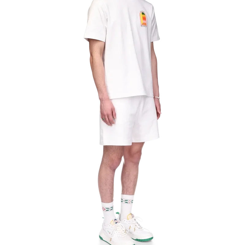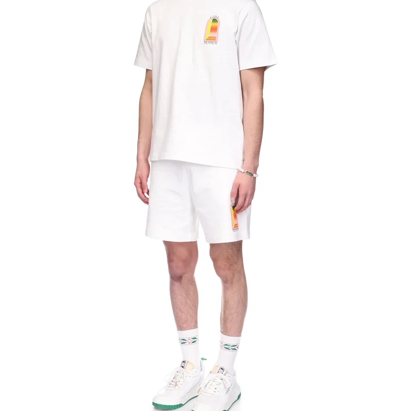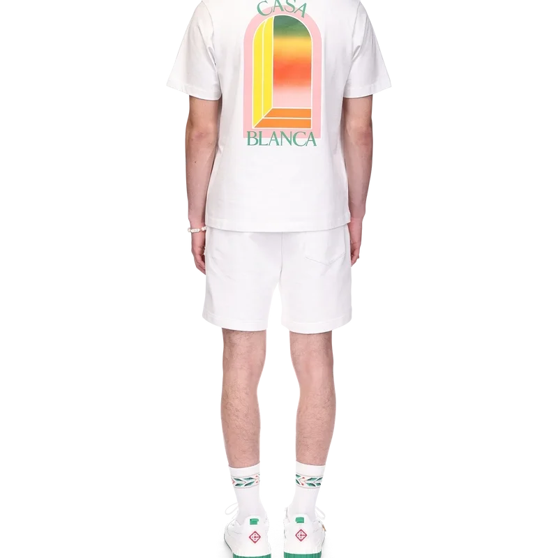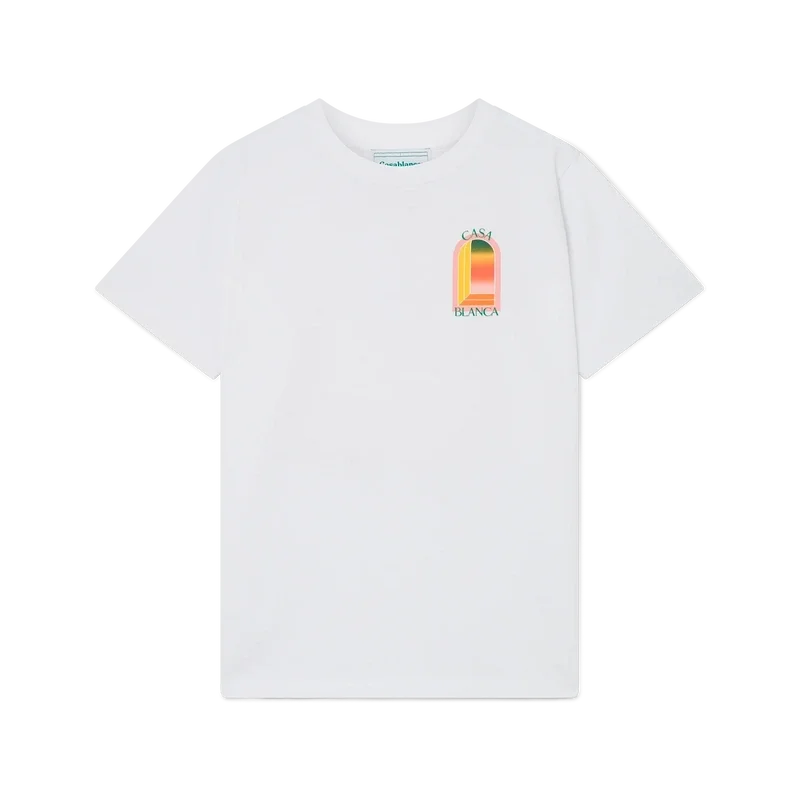Das Gradient L’arche T-Shirt ist ein kurzärmeliges Design mit dem Arch-Print in einem Farbverlauf aus warmem Gelb, Orange, Rosa und Grün, der den reichen Austausch zwischen den kulturellen Disziplinen in afrikanischer Kunst, Musik und Film symbolisiert.