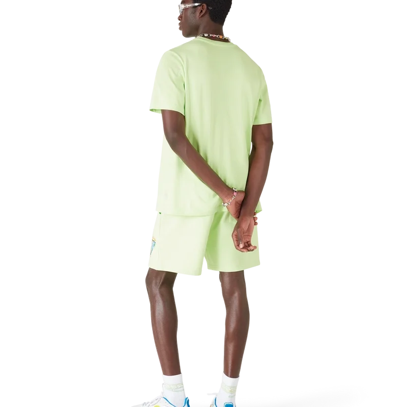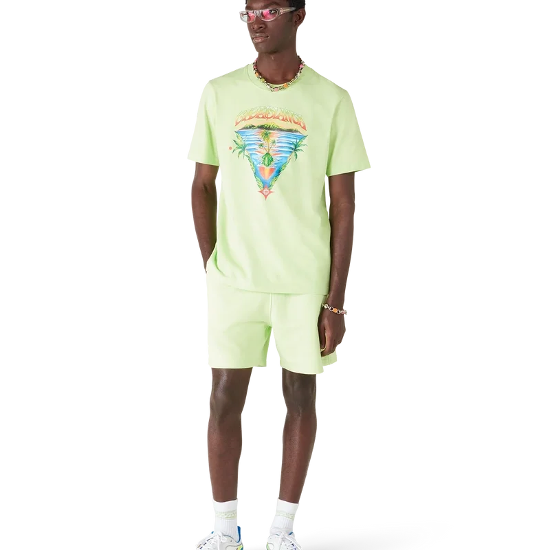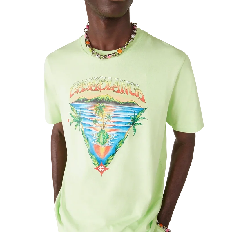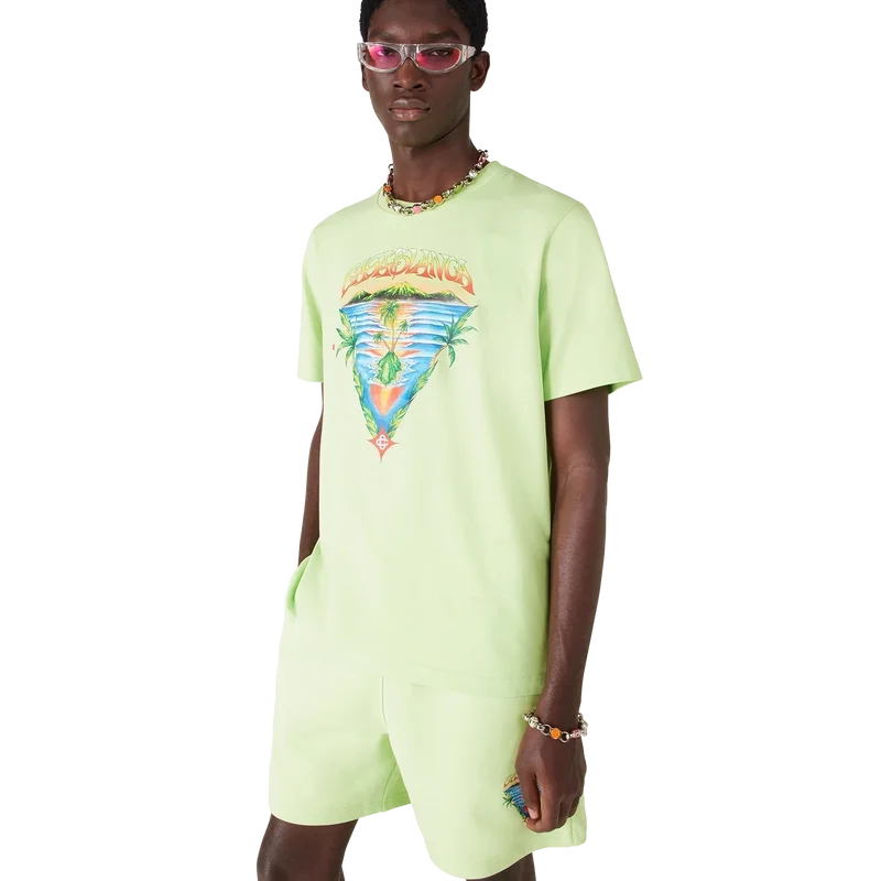 Das „Innocence Triangle Classic“ T-Shirt zeigt eine Meereslandschaft bei Sonnenuntergang mit einer Insel im Zentrum, dargestellt in einem Stil, der von klassischer Surf-T-Shirt-Kunst beeinflusst ist. Das Motiv fängt die ätherische Schönheit der goldenen Stunde über tropischen Gewässern ein und präsentiert eine idealisierte Vision eines Strandparadieses durch die raffinierte Sport- und Freizeit-Perspektive des Hauses. Abgerundet durch einen Rundhalsausschnitt, kurze Ärmel und eine lockere Passform, die den raffinierten Ansatz des Hauses in Sachen Freizeitmode verkörpert.