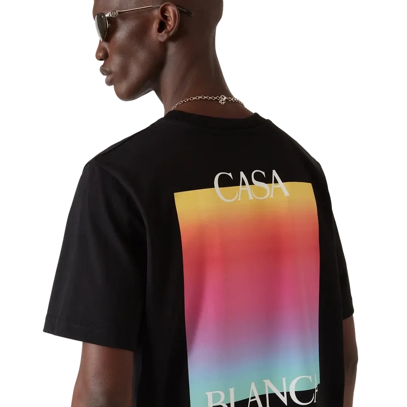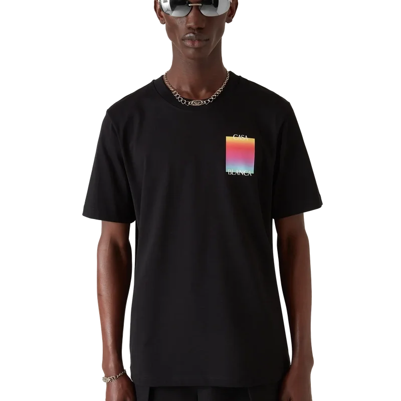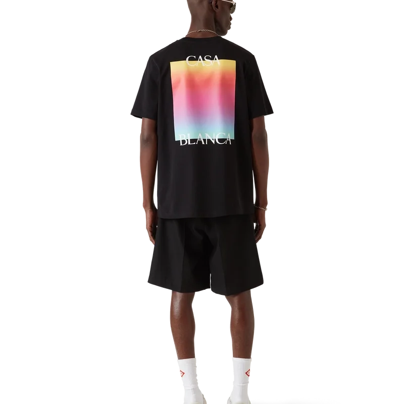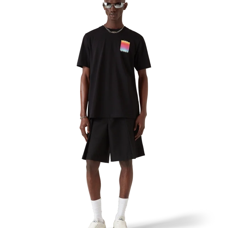 Das Kurzarm-T-Shirt mit quadratischem Logo im Farbverlauf ist ein Design, das das gestapelte Logo des Hauses und das quadratische Farbverlaufsmotiv der Saison zeigt. Abgerundet wird es durch einen klassischen Rundhalsausschnitt und eine lockere Silhouette.<!–
