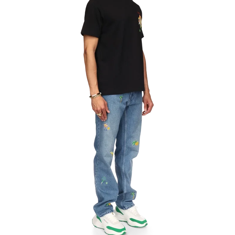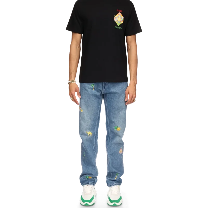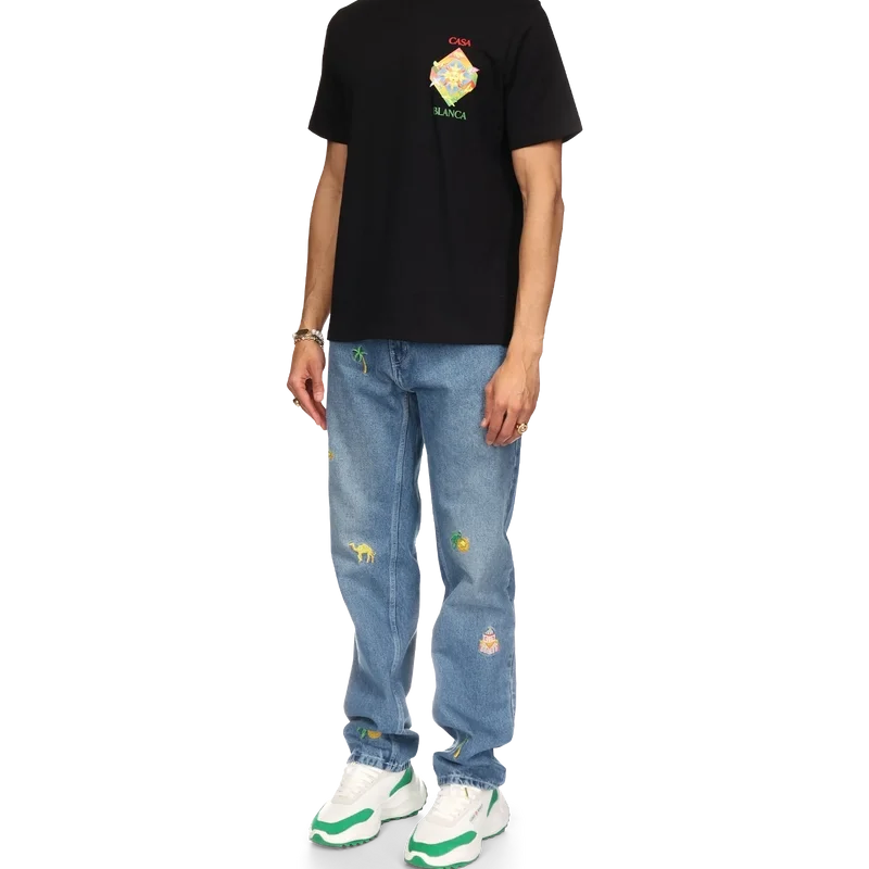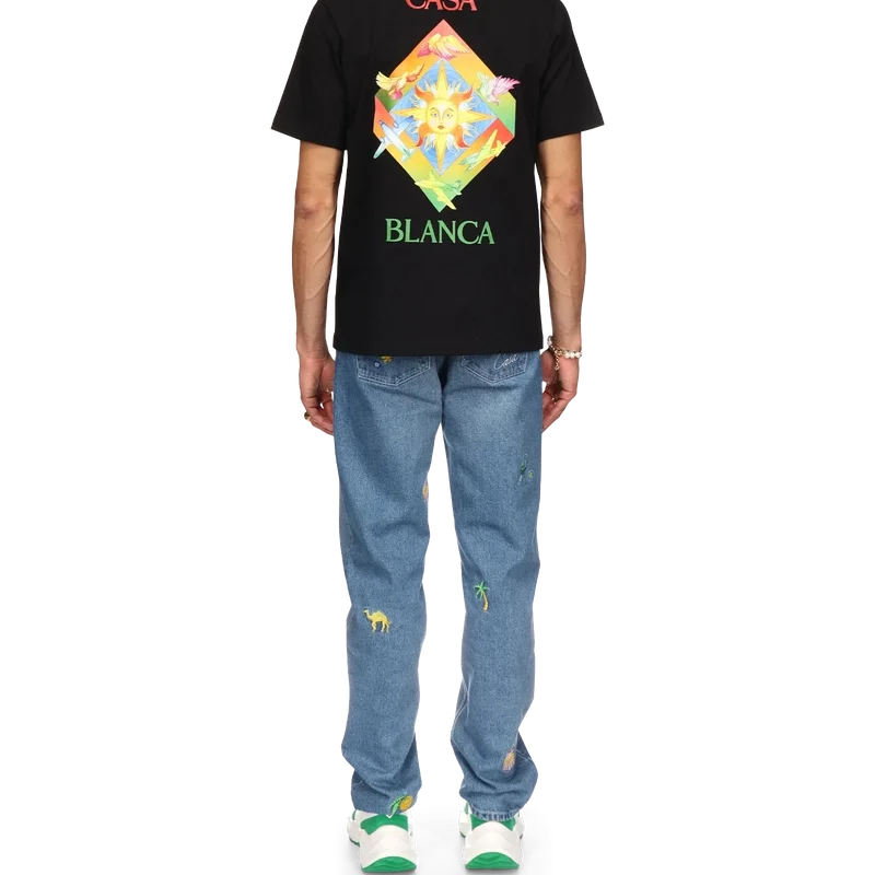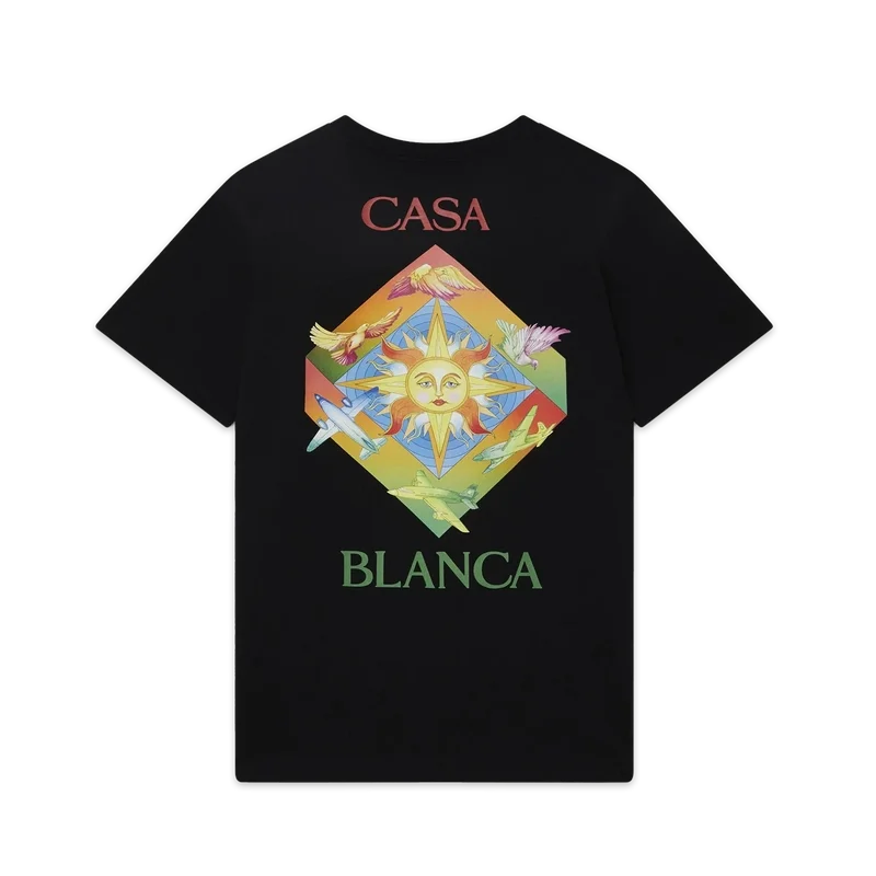 Das Les Elements T-Shirt aus Bio-Baumwolle mit Siebdruck zeigt ein saisonales Design, das die Symbolik von Casablanca und arabische Ikonografie mit Friedenstauben vereint. Mit klassischem Rundhalsausschnitt, kurzen Ärmeln und Casablanca Paris-Markenlabel, entworfen für eine lockere Passform.