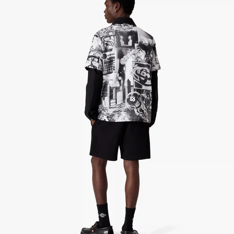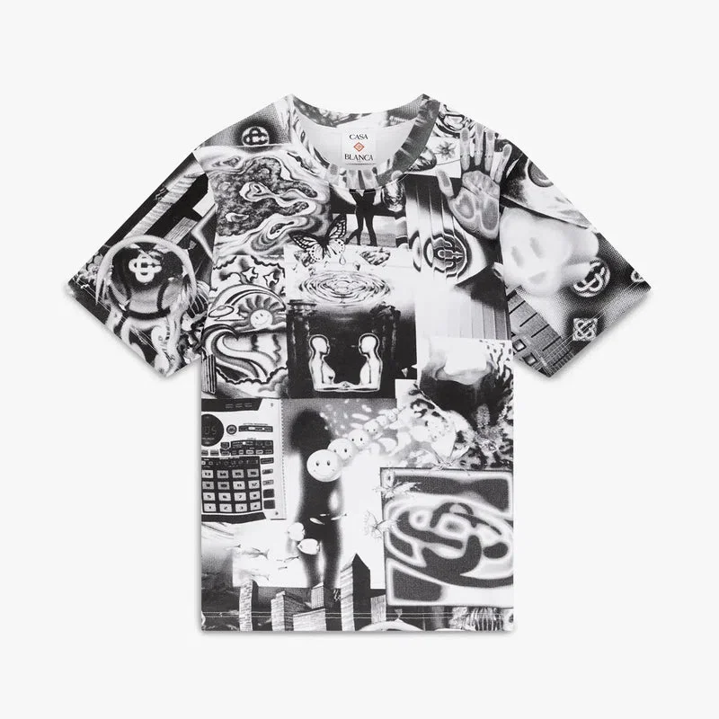 Das Rave Collage Kurzarm-Mesh-T-Shirt besticht durch ein raffiniertes Design mit saisonalen Motiven, die eine bunte Sammlung von Rave-Flyern und Symbolen in einer körnigen Textur interpretieren. Abgerundet wird das Design durch einen klassischen Rundhalsausschnitt.
